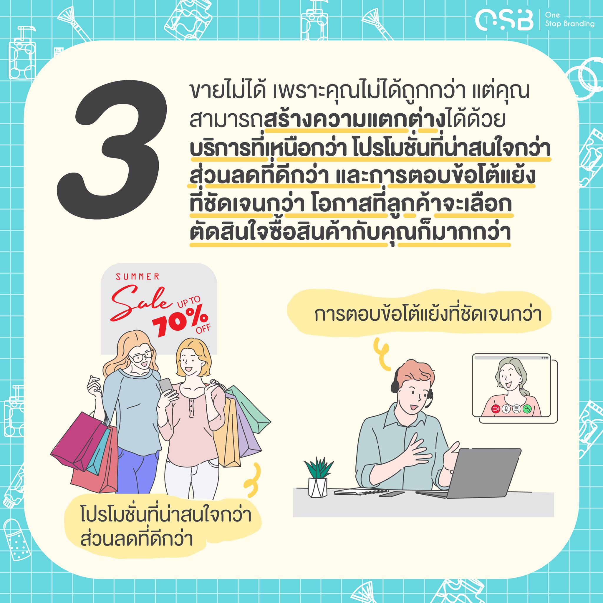3. ขายไม่ได้ เพราะคุณไม่ได้ถูกกว่า แต่คุณสามารถสร้างความแตกต่างได้ด้วยบริการที่เหนือกว่า โปรโมชั่นที่น่าสนใจกว่าส่วนลดที่ดีกว่า และการตอบข้อโต้แย้งที่ชัดเจนกูว่า โอกาสที่ลูกค้าจะเลือกตัดสินใจซื้อสินค้ากับคุณก็มากกว่า