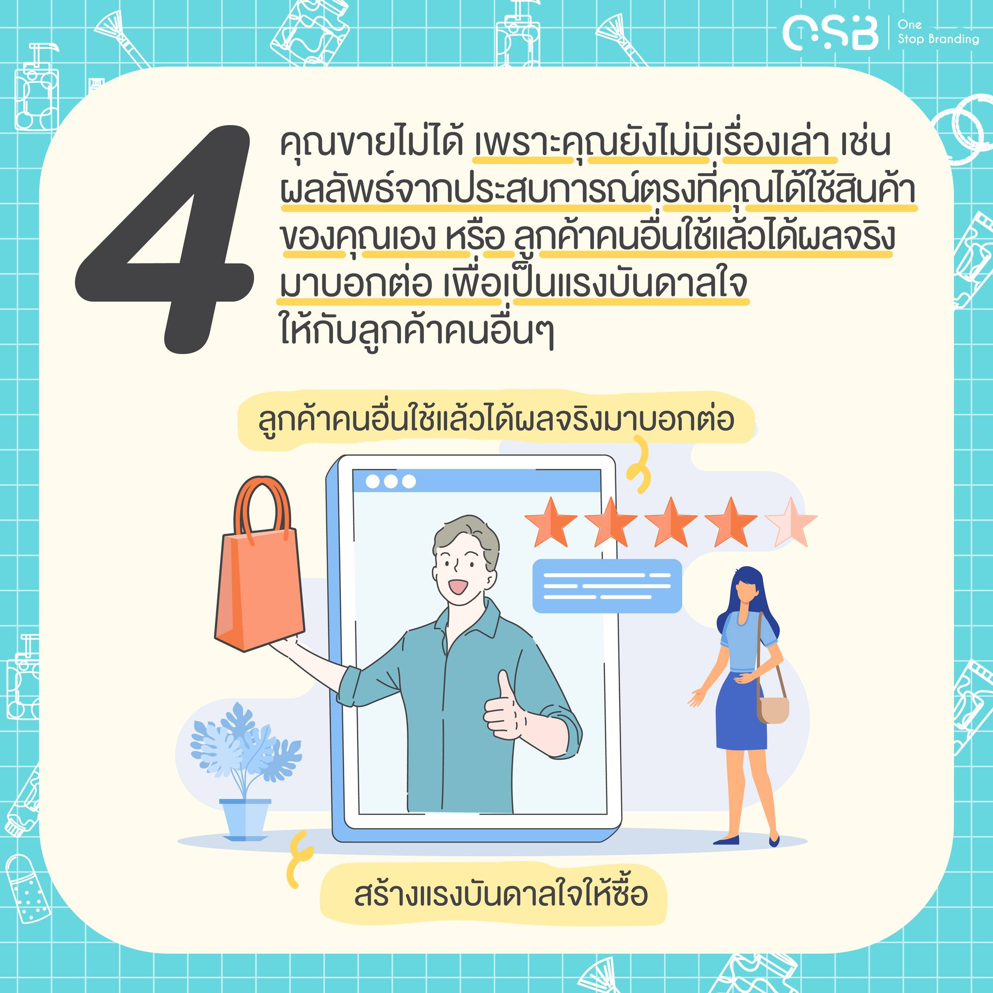4. คุณขายไม่ได้ เพราะคุณยังไม่มีเรื่องเล่า เช่นผลลัพธ์จากประสบการณ์ตรงที่คุณได้ใช้สินค้าของคุณเอง หรือ ลูกค้าคนอื่นใช้แล้วได้ผลจริงมาบอกต่อ เพื่อเป็นแรงบันดาลใจให้กับลูกค้าคนอื่นๆ