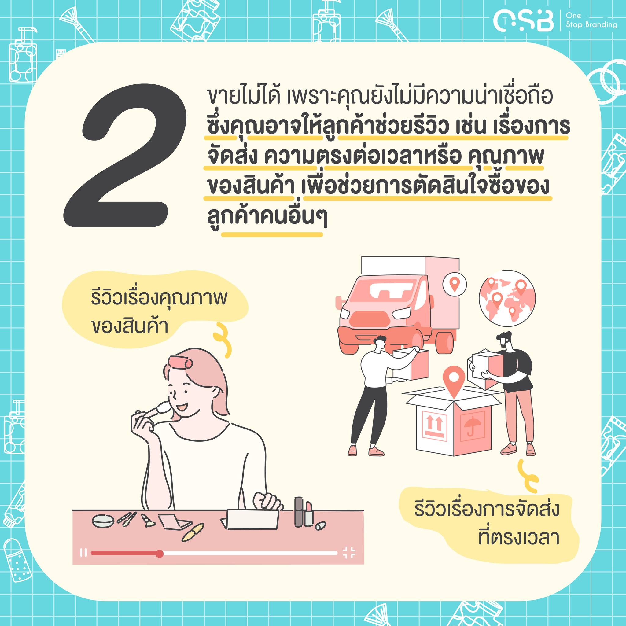 2. ขายไม่ได้ เพราะคุณยังไม่มีความน่าเชื่อถือ ซึ่งคุณอาจให้ลูกค้าช่วยรีวิว เช่น เรื่องการจัดส่ง ความตรงต่อเวลาหรือ คุณูภาพของสินค้า เพื่อช่วยการตัดสินใจซื้อของลูกค้าคนอื่นๆ